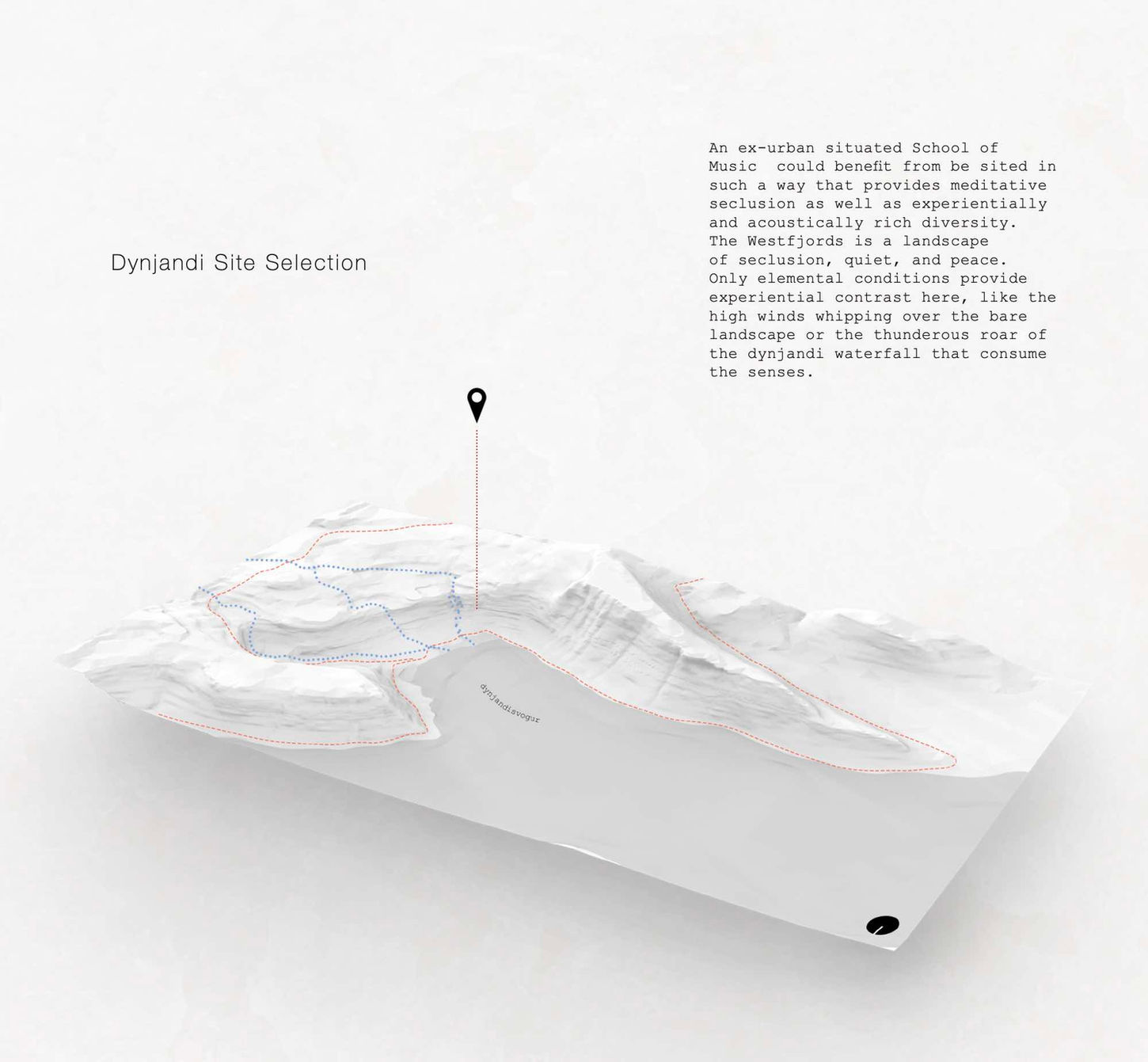 Situated halfway up the hike to Iceland's thundering Dynjandi waterfalls in the remote Westfjords, this project proposes a 4,200m² School of Music — a place for the creation, meditation, and study of music at the edge of one of Iceland's most dramatic landscapes.