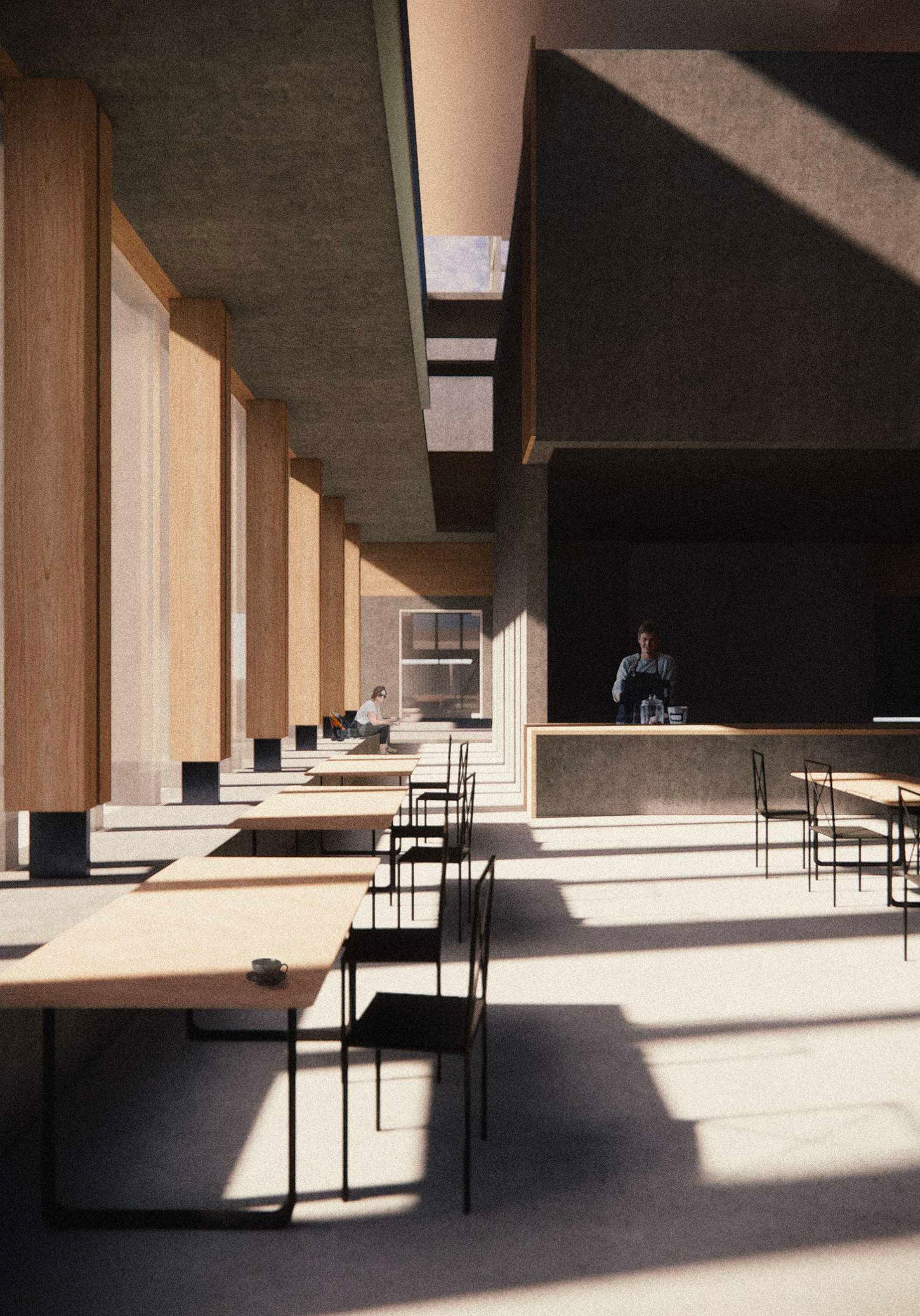 The building is lifted above the pier on a series of exposed concrete diagonal columns, preserving the daily life of the working harbour below while offering a bold architectural presence on the waterfront. A street-level entry café and performance space draws passersby inward, leading up to a sky-bridged concourse housing a music and instrument library, performance hall, café-bar venue, practice rooms, and recording studio. A detached recital hall anchors the seaward end.